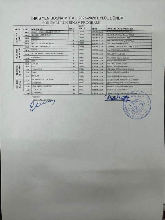 2025-2026 Eğitim Öğretim Yılı Eylül Dönemi Sorumluluk Sınavı Takvimi