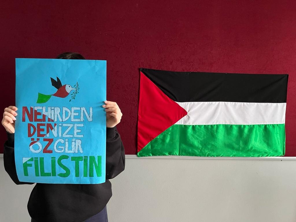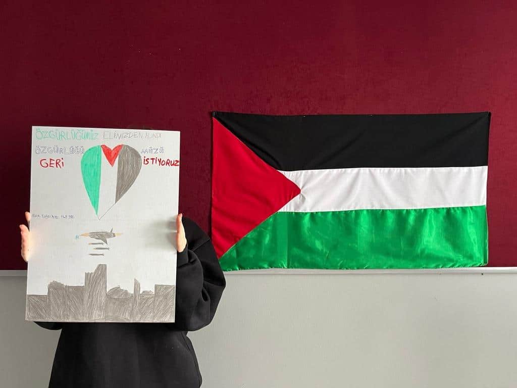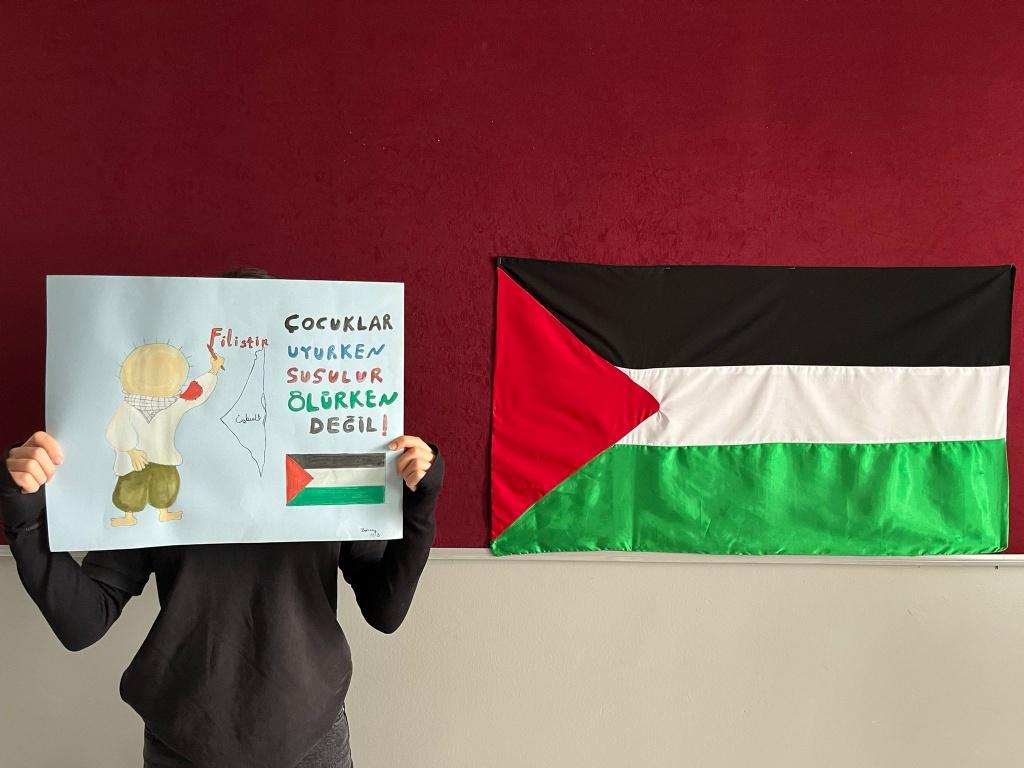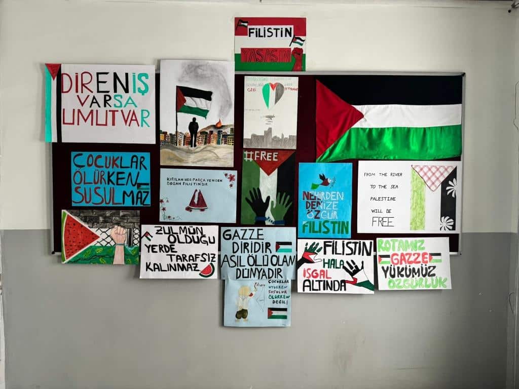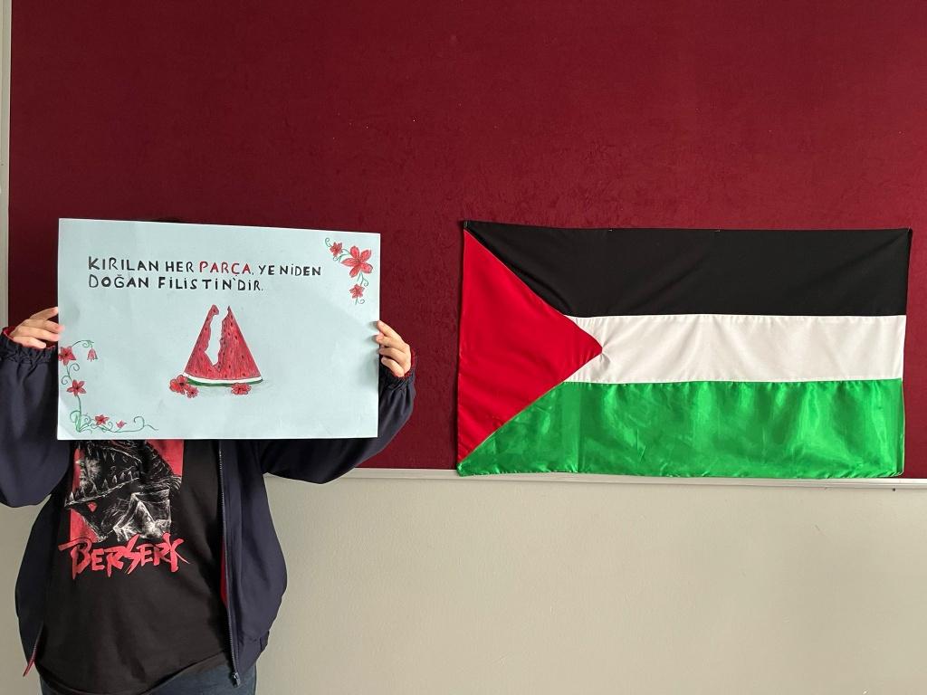 Okulumuzda, Filistin halkına destek olmak ve öğrencilerimizde barış, empati ve insanlık bilinci oluşturmak amacıyla çeşitli etkinlikler düzenlendi. Öğrencilerimiz; afiş, pano, bayrak dikimi gibi çalışmalarıyla Filistin’e olan duygu ve düşüncelerini ifade ettiler.